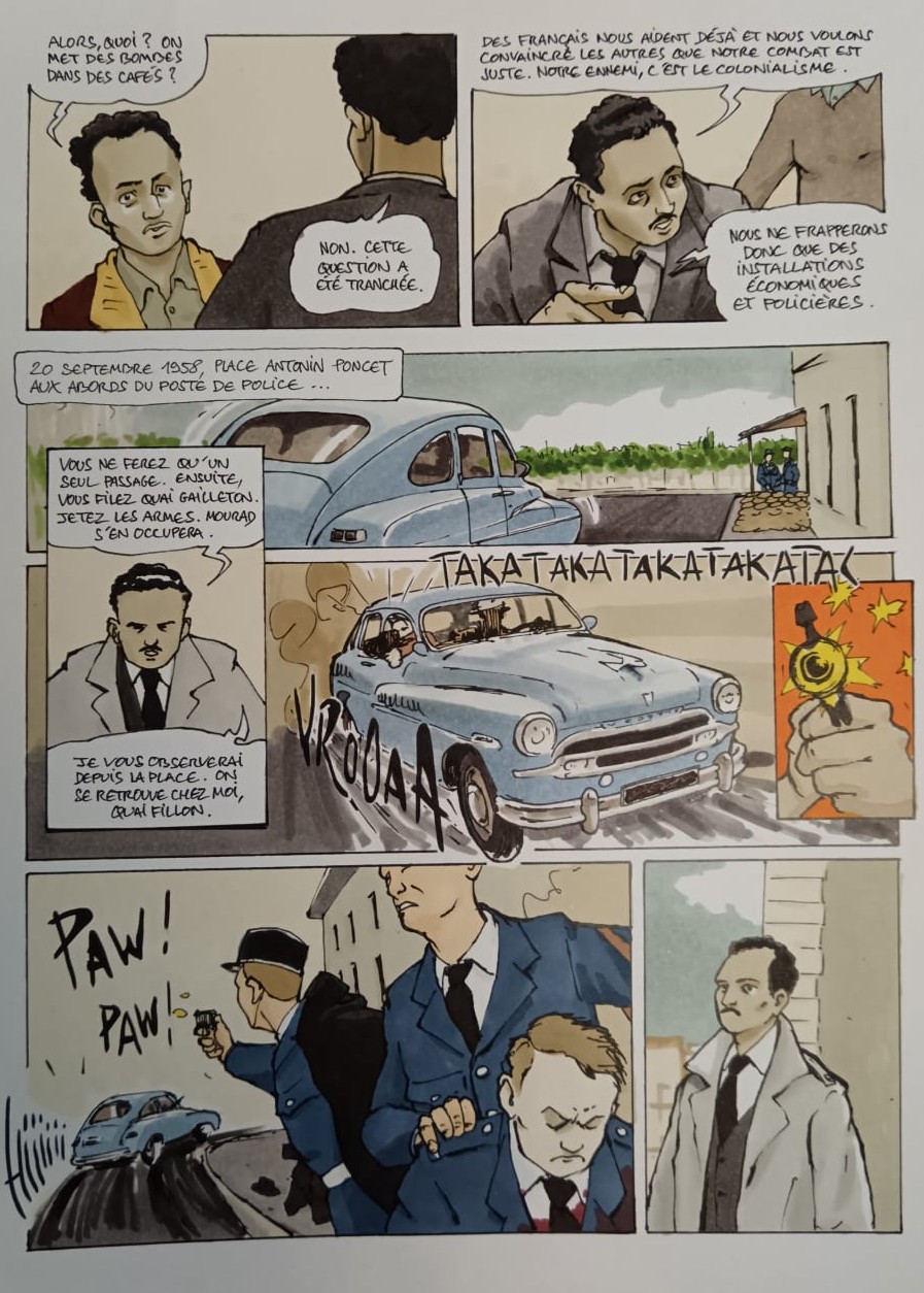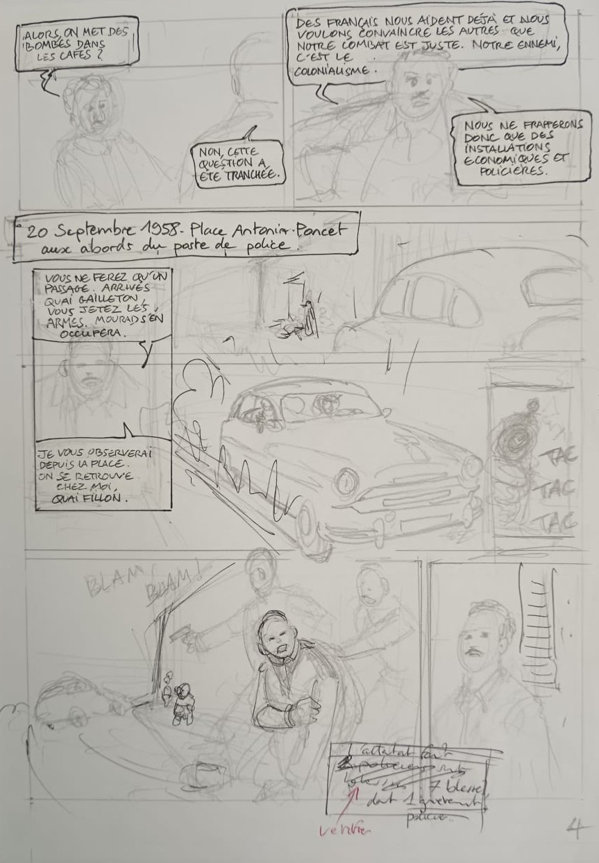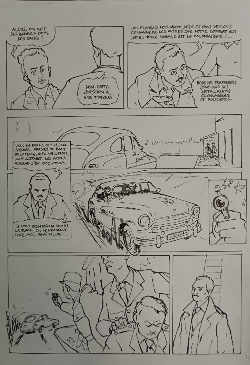 Ceci fut un premier contact pour la construction du projet entre cette classe et le dessinateur. Le but est que chaque élève puisse construire sa propre planche de BD sur le thème de la guerre d’Algérie. M. Rebière va revenir à plusieurs reprises afin de suivre les avancées des planches, les guider et les conseiller sur l’ensemble du projet.