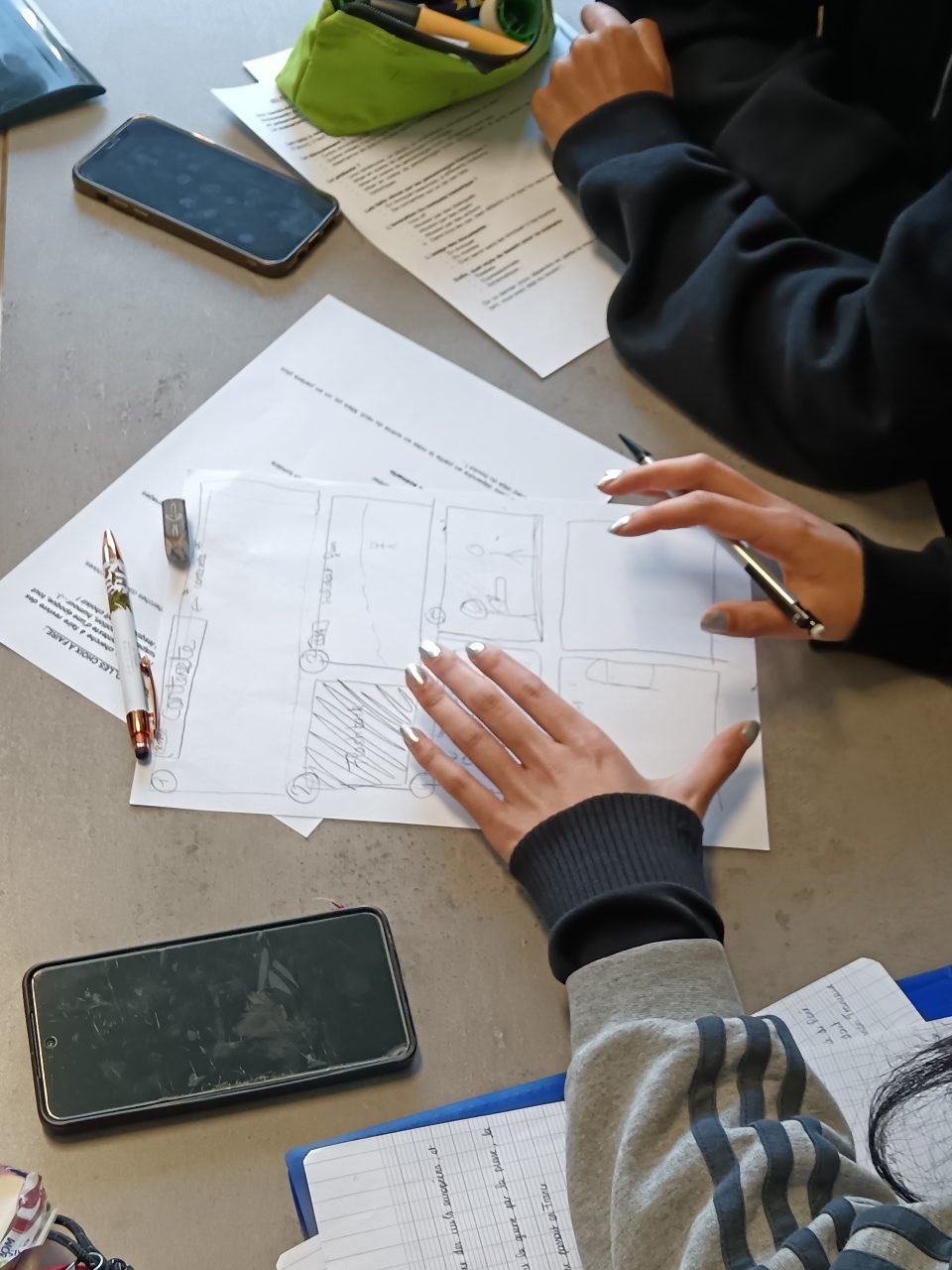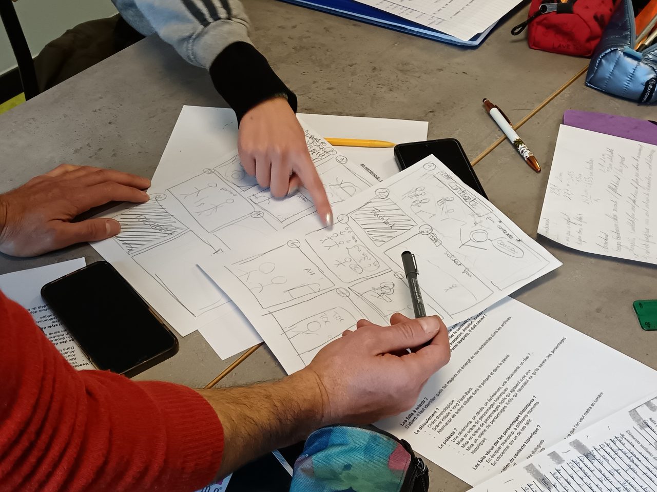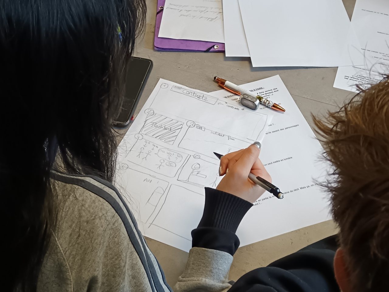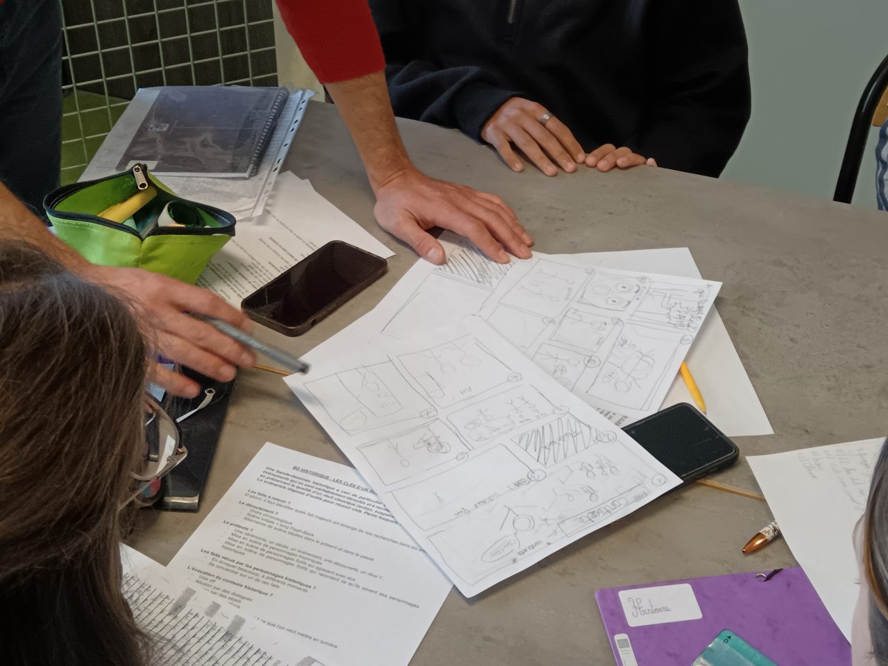 Les apprentis dessinateurs réunis en groupe de 4 ont reçu de la part de Mathieu Rebière le conseil fondamental de “définir les points à mettre en valeur dans leur planche de BD”. Pour cela, il a pu leur exposer des planches réalisées par d’autres collèges et lycées. L’objectif de base est de faire le choix de l’histoire et comment la mettre en valeur à travers la création d’une bande dessinée.