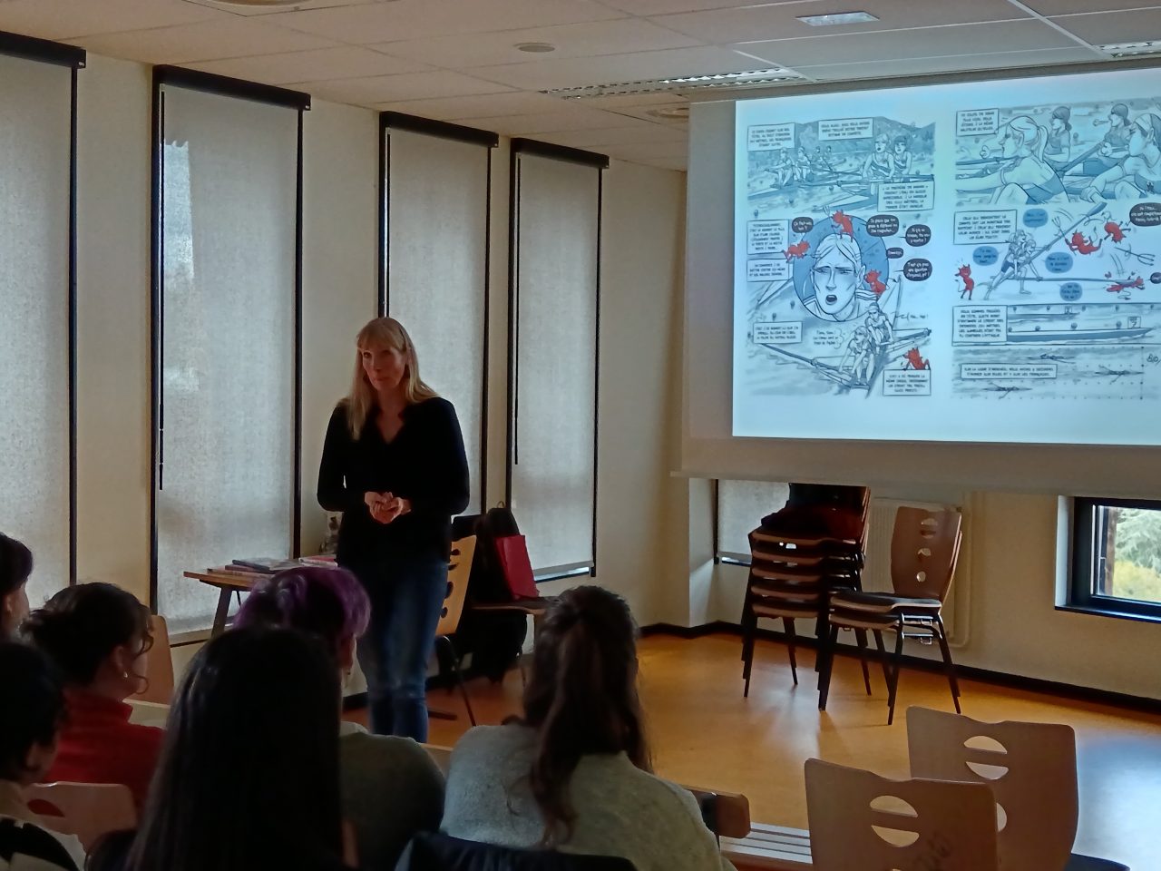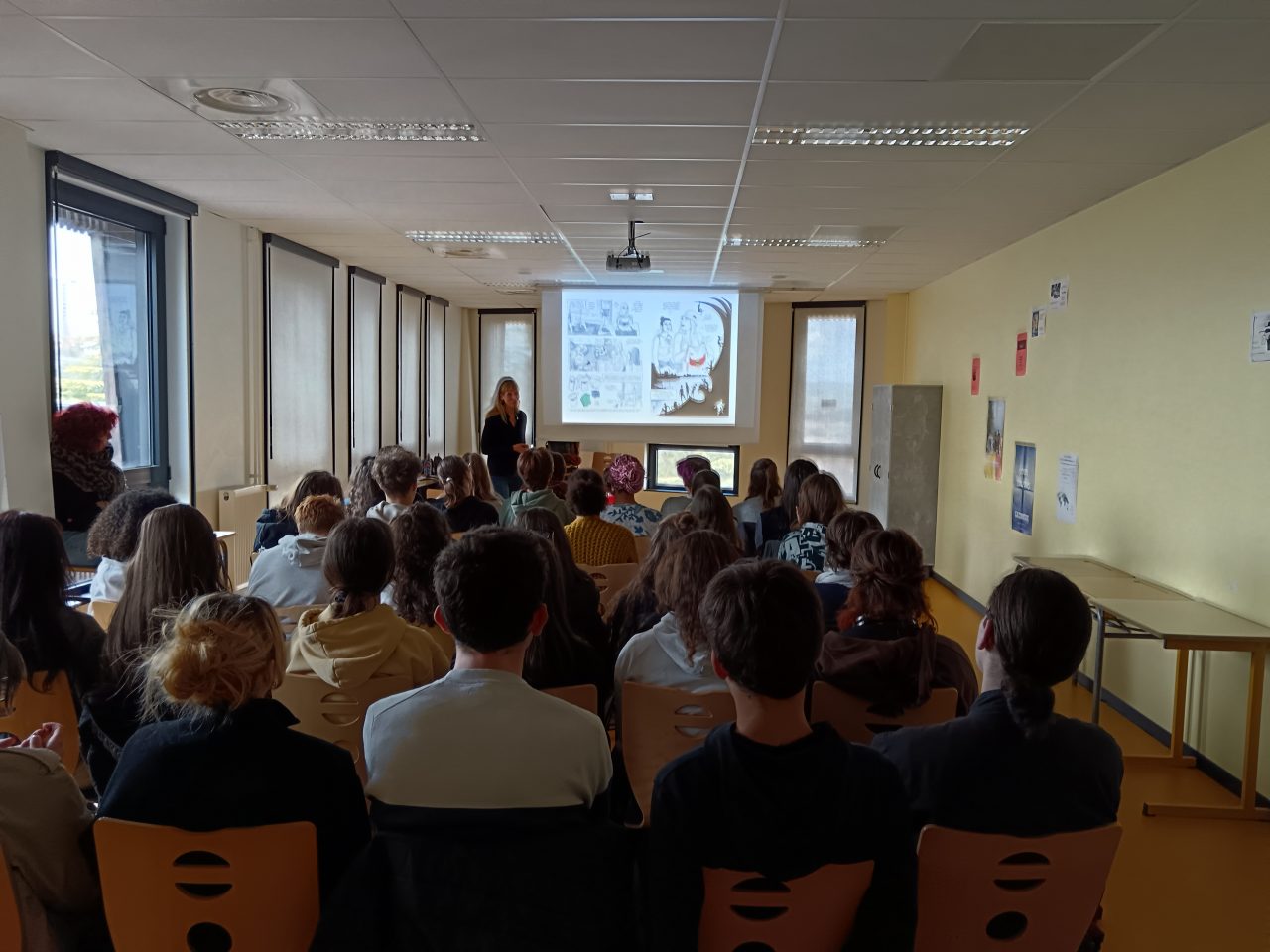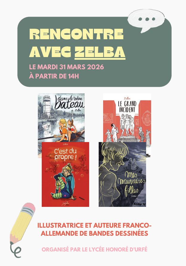 Le mardi 31 mars 2026, Zelba, illustratrice et autrice franco-allemande de bandes dessinées, nous a fait l’honneur de sa présence afin de rencontrer l’ensemble des classes ABIBAC (qui a un cursus en langue allemande) ainsi que quelques élèves étudient l’histoire de l’art. Elle a créé plus de 13 bandes dessinées, la première sortie en 2009.